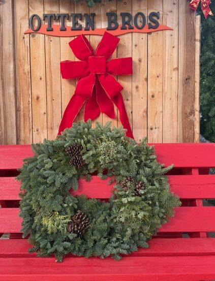 Our premium balsam wreath decorated with cones, berries and a hand-tied wired red velvet bow. Diameter of 25″
